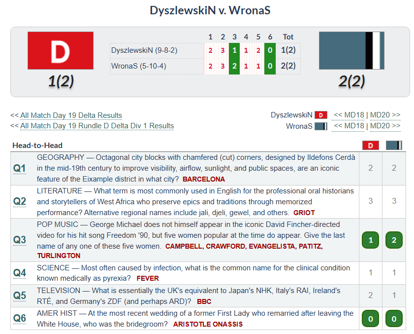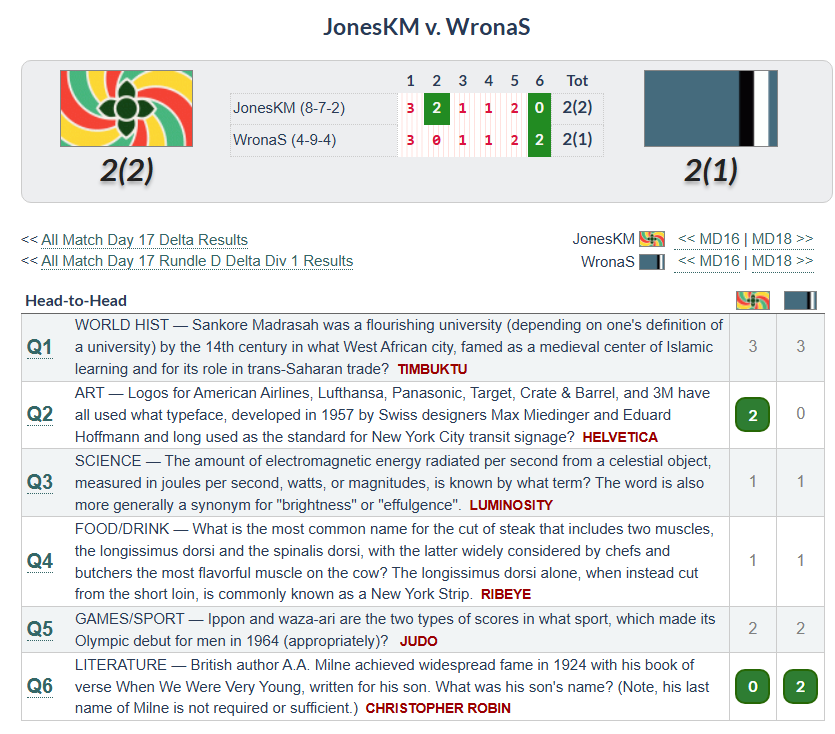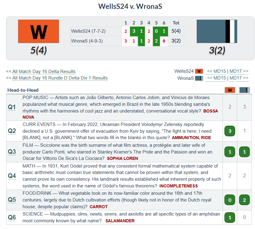 The ones I got wrong I just didn’t know, although I had heard of Gödel’s Incompleteness Theorem, come to think of it. I put flamenco for #1, allies and refuge for #2 (just hadn’t heard the quote and I sure haven’t read enough about most of the recent wars), recursion for #4, and frog for #6. It seems I miss all these animal questions that everyone else finds really easy. It’s true that I didn’t watch a lot of nature documentaries and stuff and I’m assuming most of the players in the league did, but I also don’t think this is stuff that comes up in science classes much either. This is the first and only food question I have gotten, because it’s a food even anti-foodies like me have heard of and because I’d certainly heard of the House of Orange.