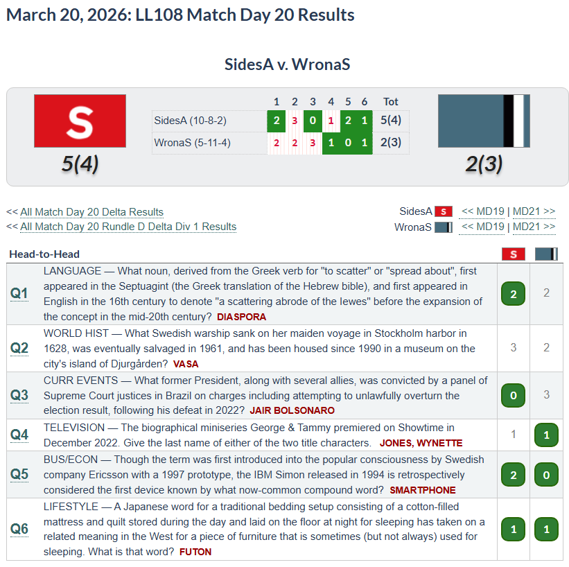 This might’ve had a couple of my most embarrassing misses. I don’t know why I thought other people were going to find smartphone so difficult (maybe because I wasn’t completely sure myself). I really should have gotten #1 and #3. I had diaspora right. I thought of it and then I changed to holocaust because I remembered the animal sacrifice definition from the Old Testament and I knew holocaust was used in that context a lot, while I wasn’t sure if the word diaspora was used (definitely not in the King James Version). I’m embarrassed by this just because that answer is in bad taste, but granted, the actual answer of revolver a couple days earlier was probably in just as bad taste, so it’s not like it was out of the question. And then I put Lula instead of Bolsonaro because I knew that Lula was a former President and that he was put in prison, and I kind of thought Bolsonaro was still President and didn’t realize that he no longer was. I had nothing for question #2.
