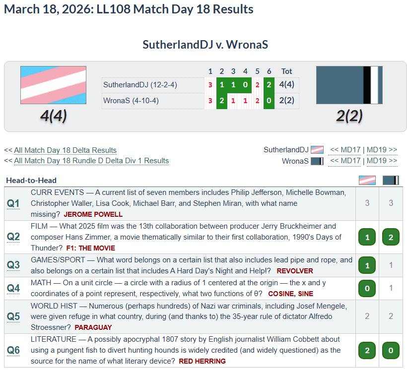 Haven’t watched the F1 movie yet. For all my racing fandom, I’ve never really gotten into racing movies and it’s not one of my favorite genres, but given my racing fandom, I’ve certainly heard of it. I got the math question backwards. While I certainly remember the whole SOHCAHTOA mnemonic from high school (sine = opposite/hypotenuse, cosine = adjacent/hypotenuse, tangent = opposite/adjacent) for right triangles, I had no such mnemonic in my head for unit circles, so I got that backwards. #1 I put Keir Starmer (I was guessing British Labour Party leaders). #5 I put Argentina, which was a more popular answer than the actual answer of Paraguay since it is much more common knowledge that a lot of Nazi war criminals fled to Argentina than Paraguay. #3 was one of my most embarrassing misses. Obviously I got that it was Beatles albums, but I didn’t understand what the other category was. I was thinking that it was material for construction, so I put rubber (as in Rubber Soul), but apparently it was things you use in the act of self-deletion. Pretty dark answer really.
