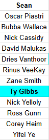 This year, I drew the third spot. George Russell was the first driver taken by Andy’s brother, who assumed (like most) that Mercedes is going to dominate in F1 this year, but the second player picked Lando Norris, and I picked Oscar Piastri, because even though Russell is a better driver than the other two, McLaren’s chassis may still be better than the Mercedes team’s chassis at his been in previous years, although I’ll admit Piastri vs. Max Verstappen was a tough decision. It was also a surprisingly tough decision whether to keep Ty Gibbs as I have for the past several years or switch to David Malukas, who I signed last year before he went to Penske. As it turned out, I ended up getting to draft Malukas again anyway. I really wanted to switch off Gibbs as he’s become such a disappointment relative to expectations, but even somebody who scores a top 20 points total in Cup is still way too valuable to let go and I realized that. But I did draft Corey Heim later to give me an option if he finally gets a Cup ride, ‘cause I think whenever he finally gets the ride he deserves, he’s gonna be better than Gibbs and I’d rather go with him for the long haul (someone else already had Zilisch, and somebody did draft Colton Herta in the final round this year). Anyway, here was who I drafted (bizarrely, all drivers with pretty short names):